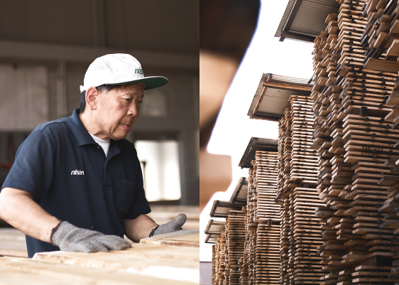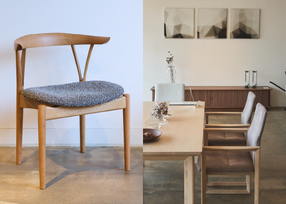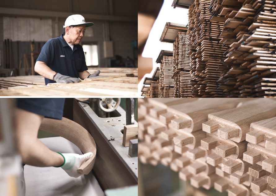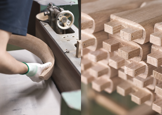 そのなかで、受け継がれてきた飛騨の匠の技術は、「良質な木材を選定し、適材適所に仕分けていく眼」「家具作りに欠かせない木材の乾燥技術」「木材に美しい曲線を与える曲木の技術」「木造建築の柱と梁をつなぐ木組みの工法と同じ角ホゾの技術」として日進木工の家具作りに継承されています。この独自の技術に、デザインへのこだわりが加わり、日進木工ならではの高品質で洗練された家具が生まれていきます。