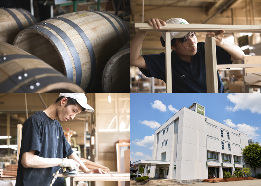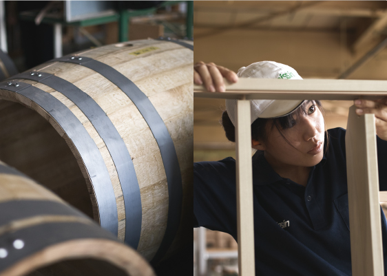 日進木工は今、「飛騨の匠」の技術を活かした新しい取り組みに挑戦しています。そのひとつが「ウイスキーの樽作り」。2023年、高山市に岐阜県初のウイスキー蒸留所ができ、その蒸溜所の社長と北村社長がに親交があったことからはじまった事業です。良質な木材の目利き、曲木の技術、そして職人の丁寧な手仕事から生まれる高品質な樽は「HIDA BARREL(ヒダバレル)」と名付けられ、蒸留所やバーなどに納められています。北村社長は語ります。『日進木工は、もうすぐ80周年。少し遠いですが、その先には100周年が控えています。今後のことも見据えて、木工技術、家具作りの技術を活かしてできることを、さらに広げていきたいと考えています。ウイスキー樽のバレル事業と、他にもひとつ、我々だからできる新規事業を計画しているところです。』。